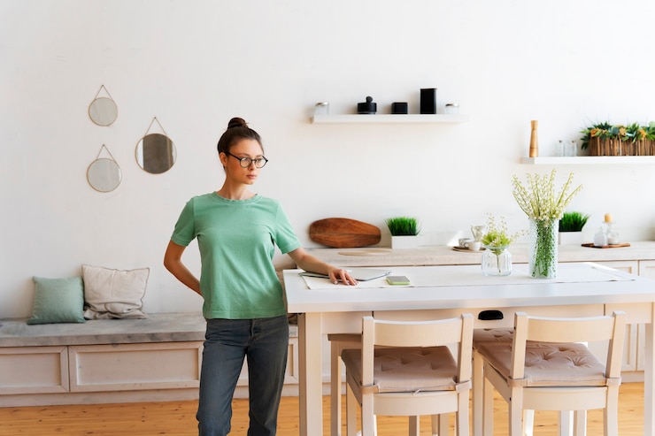 Кухню можно зонировать, выделив рабочую область и зону для приема пищи. Для этого используйте разные напольные покрытия: разместите линолеум возле обеденного стола, а плитку – в зоне приготовления пищи. Альтернативным вариантом может быть установка легкой перегородки или ширмы.