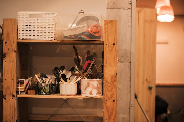 Современный шкаф с асимметричными полками предоставляет возможность демонстрировать антикварные фотоаппараты, книги и вазы. Такой способ организации хранения акцентирует индивидуальность владельца и превращает полки в экспозицию, а не просто в место для хранения вещей.