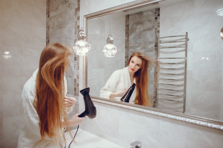 На потолке установлено достаточное количество точечных светильников, обеспечивающих равномерное освещение всего пространства комнаты. Над раковиной закреплено зеркало с подсветкой, которое выполняет как практическую, так и декоративную функции: оно обеспечивает свет, необходимый для ухода за собой и макияжа, и создает нужную атмосферу, выделяя детали.