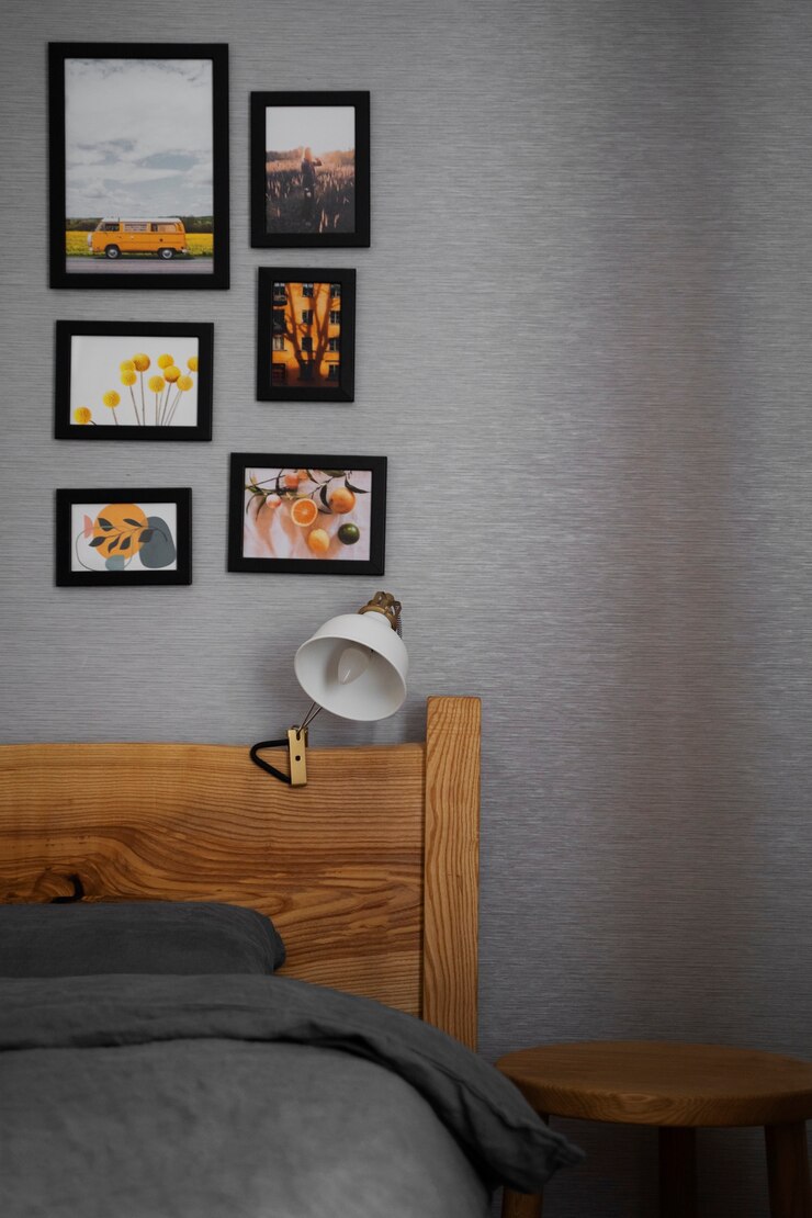 В спальне стремились обеспечить наивысший уровень удобства: был тщательно подобран комплект из кровати и матраса, а для придания интерьеру большей выразительности оформили акцентную стену. Панели для стены были изготовлены на заказ в мастерской, где элементы соединили в единую композицию, напоминающую пазл. Мягкие элементы были собраны в каркас и закреплены на квадратной основе, что позволило создать необычный и привлекательный вид.