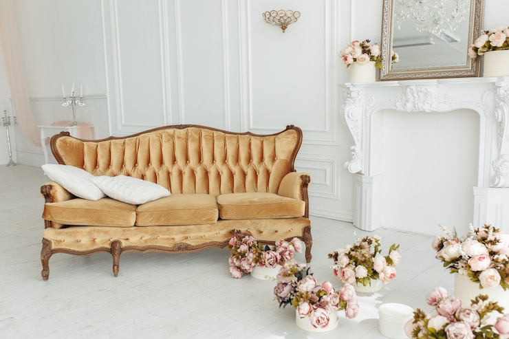 Украшают помещение светильники, аксессуары и дверные ручки из золота, состаренное зеркало каминного портала, плитка в ванной, тонкие мозаичные линии санузла и нарезанный из глянцевого керамогранита ковер в прихожей. Такой же стиль повторяют отдельные предметы мебели с лёгкой отсылкой к ар-деко, например, стеллаж в гостиной.
