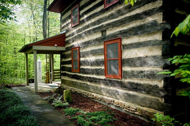 Покрытие лаком деревянный брус, из которого построен дом, со временем потемнел и приобрел медовый оттенок. В ходе ремонта светлый вид дому вернули с помощью тонировки бруса и белого потолка, выполненного из вагонки. Были заменены двери и наличники окон. Внешний вид камина также претерпел изменения: портал оформили светлой декоративной штукатуркой.