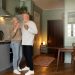 Александр Дмитрук, дизайнер, преобразил маленькую кухню необычного формата. в своей квартире Создано удобное и функциональное пространство. Выбран лаконичный кухонный гарнитур по периметру всей площади с встроенной бытовой техникой. Угол кухни обыгран узкой полкой для бакалеи, сверху и снизу от которой размещены узкие закрытые шкафчики для хранения продуктов и бытовых вещей.