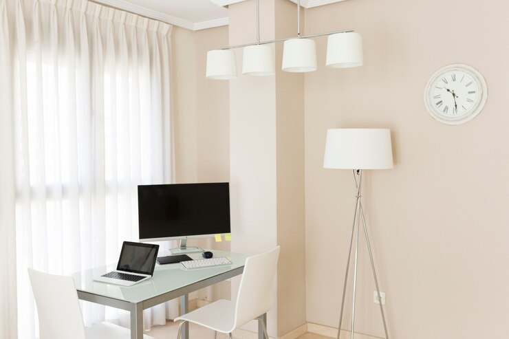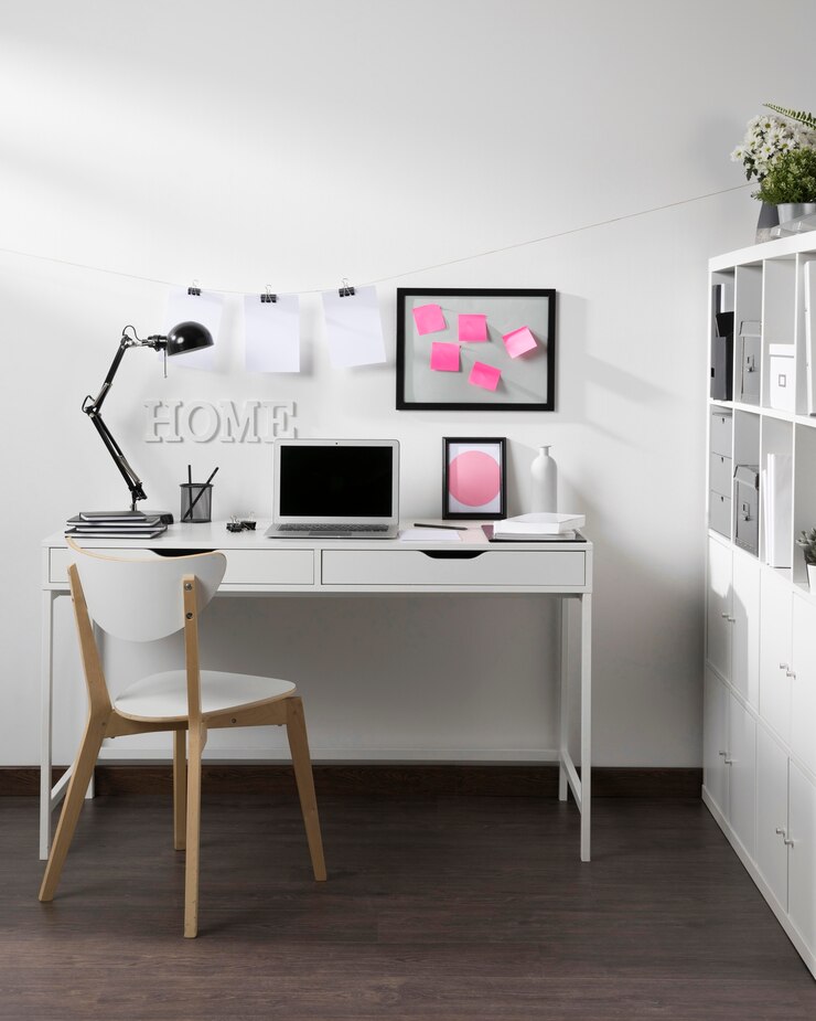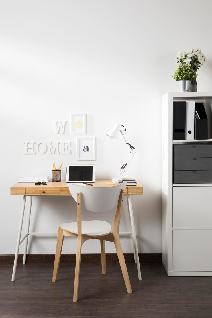 Кабинет выделен насыщенно-зеленым цветом, который хорошо сочетается с красной перегородкой и изящными деталями светильника. В зоне работы установлен комфортный стеллаж с узкими полками.