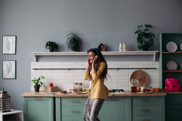 Солнечный свет наполняет кухню благодаря сочетанию яркого голубого и лимонно-желтого цветов. Обои с изображением лимонов над диванчиком послужили источником вдохновения.