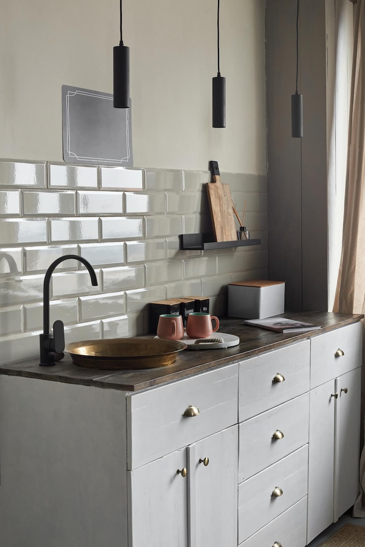 Линейная кухня, изготовленная по стандартам ИКЕА, имеет верхние шкафы белого цвета, что позволяет избежать перегруженности пространства. Подоконник используется как дополнительная рабочая поверхность, на которой установлен чайник, для подключения которого предусмотрены розетки в боковых частях окна. При замене окон было обеспечено необходимое расстояние от подоконника до открывающихся фрамуг, чтобы избежать препятствий при открывании окна.