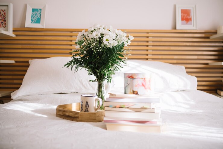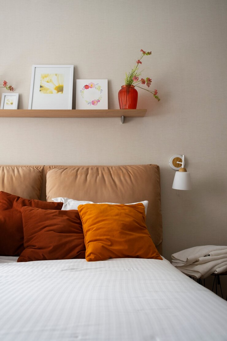 Яркие акценты, например, цветное изголовье необычной формы, помогут отвлечь внимание от размеров комнаты. На светлом фоне оно будет заметно выделяться: для баланса композиции подвесьте по обе стороны светильники с большими абажурами.