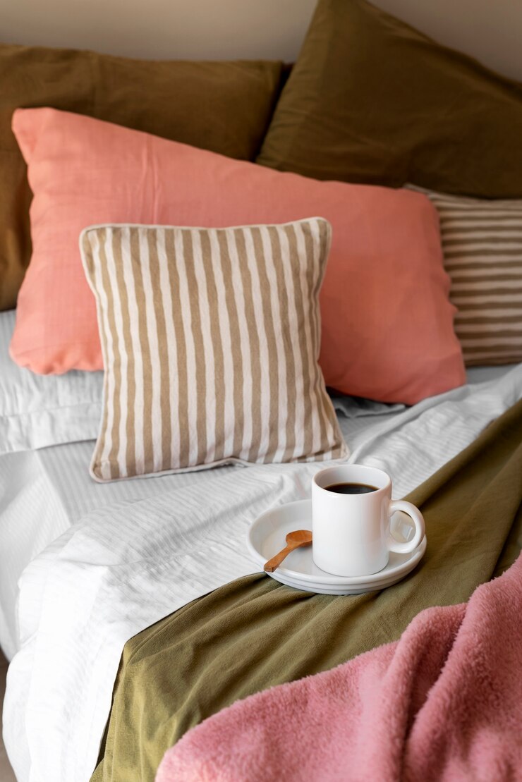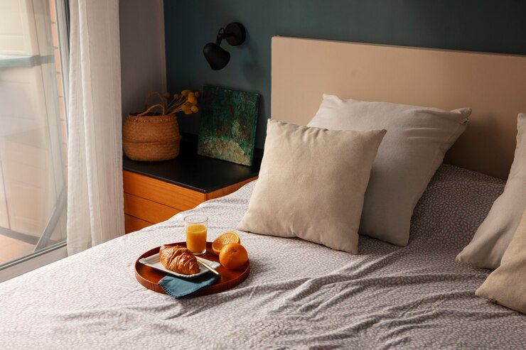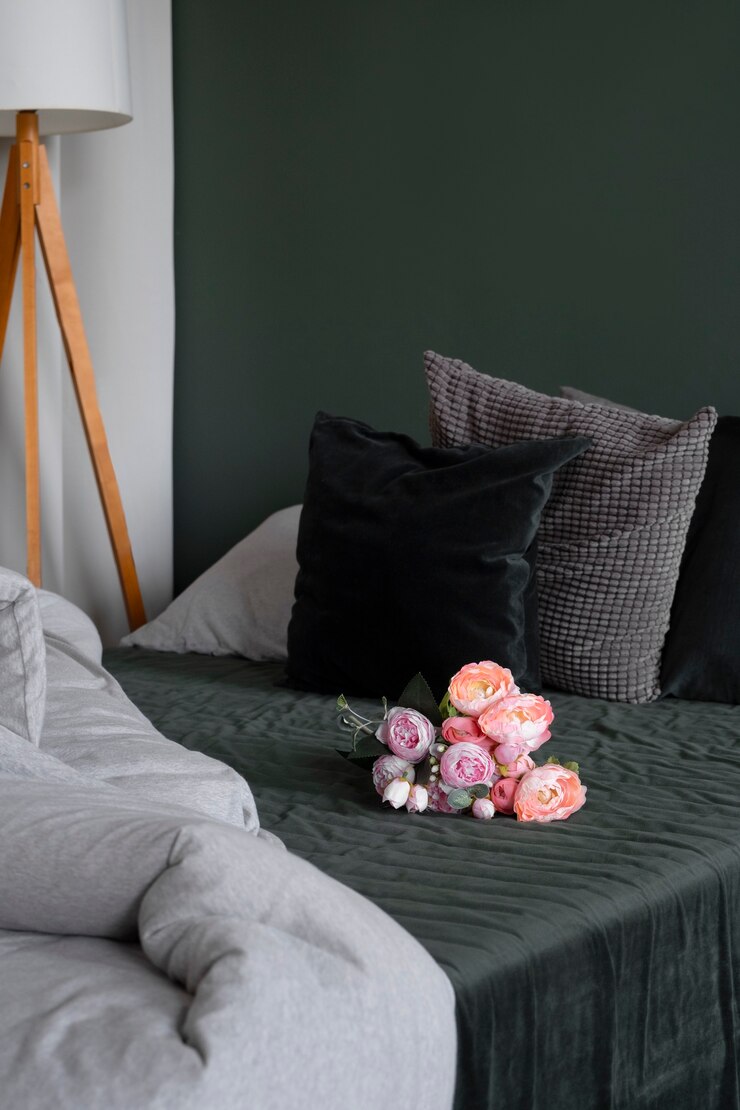 Не стесняйтесь использовать яркие цвета и пробовать разные решения в оформлении – даже самая стандартная спальня в квартире обычной планировки может превратиться в интерьер, достойный глянцевого журнала. Отдайте предпочтение современной мебели и декоративных элементов, а также добавьте цветной текстиль, например, оливкового оттенка.