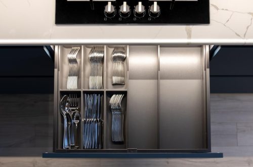 Сначала была демонтирована дверь, разделявшая кухню и гостиную, что позволило значительно увеличить пространство. При проектировании особое внимание уделили встроенной технике и скрытым системам хранения: холодильник был полностью замаскирован за мебельными фасадами, микроволновая печь помещена внутрь верхних шкафов, а для сохранения максимальной площади столешницы была выбрана встроенная варочная панель.