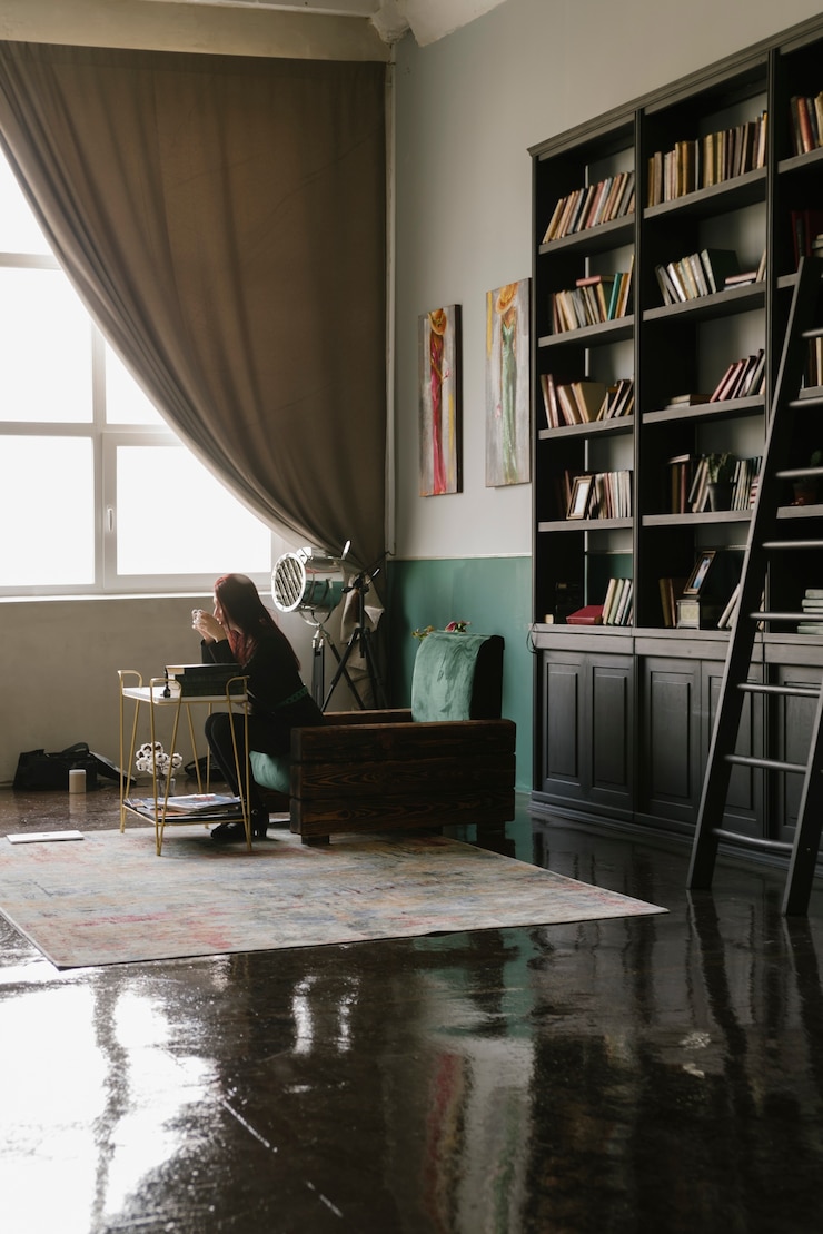 В гостиной организовали зону отдыха, рассчитанную на четырех-пяти посетителей. Прежние владельцы оставили здесь стеллаж, который был отреставрирован и заполнен аксессуарами, создающими атмосферу середины 20-го века, а также фотографиями и рукописями Высоцкого. Стену за стеллажом и гитарой украсили гипсовыми панелями с латунными вставками. За телевизором расположена стена, отделанная фактурной штукатуркой.
