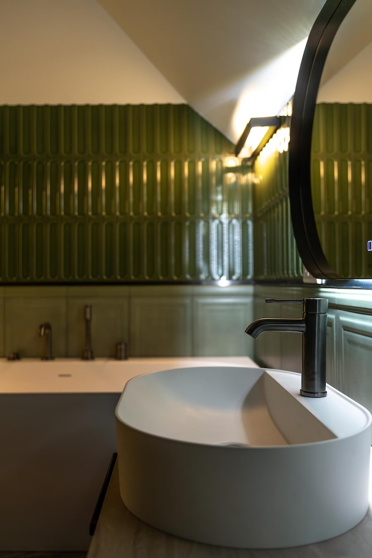 Чтобы зрительно расширить помещение и создать эффектный акцент, Ксения применила зеркало, которое занимает всю стену и оснащено подсветкой и встроенным смесителем. Благодаря освещению спереди, лицо хорошо видно при макияже, а интерьер приобретает современный вид.