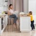 Кухонный гарнитур изготовлен по индивидуальному заказу. В левой пенальной секции размещены встраиваемый холодильник, духовой шкаф и «аптекарский шкаф». Угловая конфигурация спроектирована без верхних шкафов. Слева от мойки установлена встраиваемая посудомоечная машина. Под газовой варочной поверхностью предусмотрены ящики для хранения.