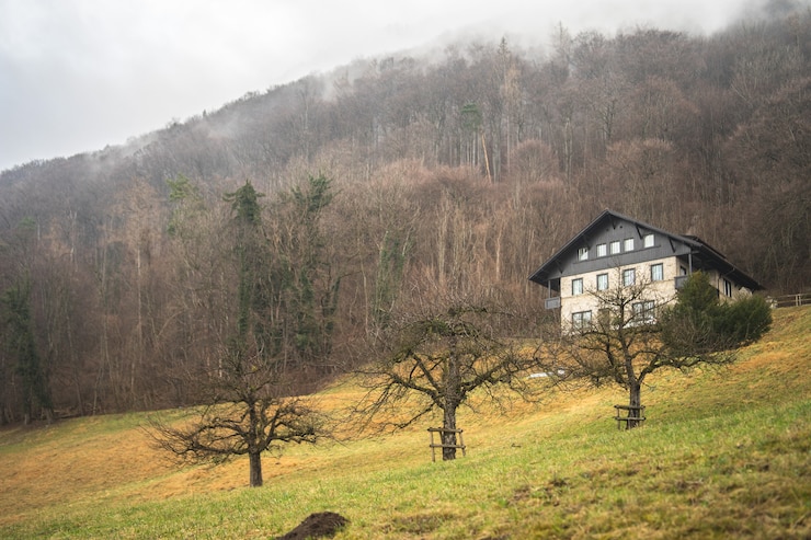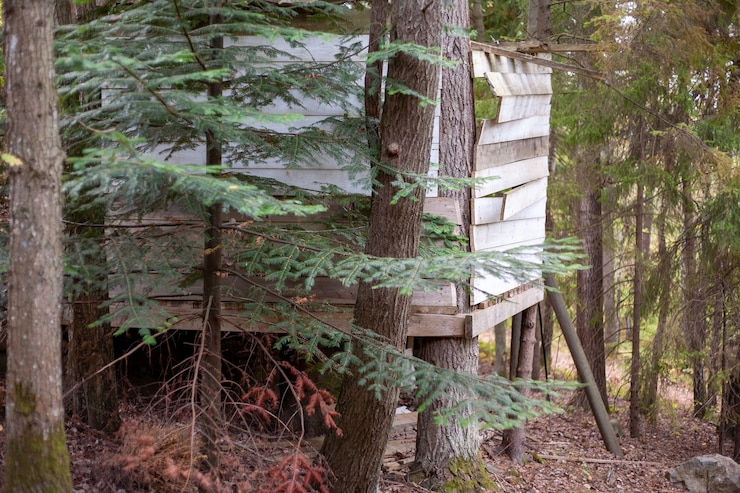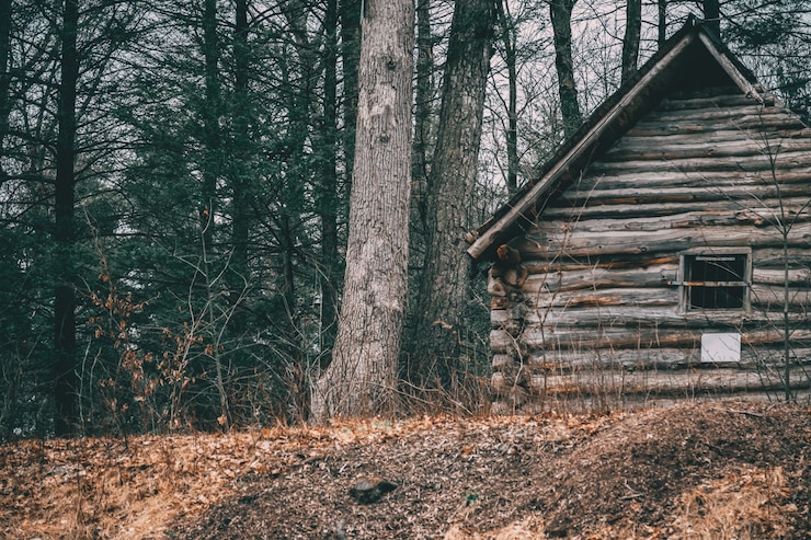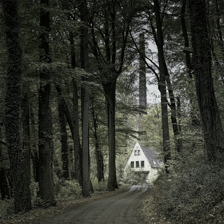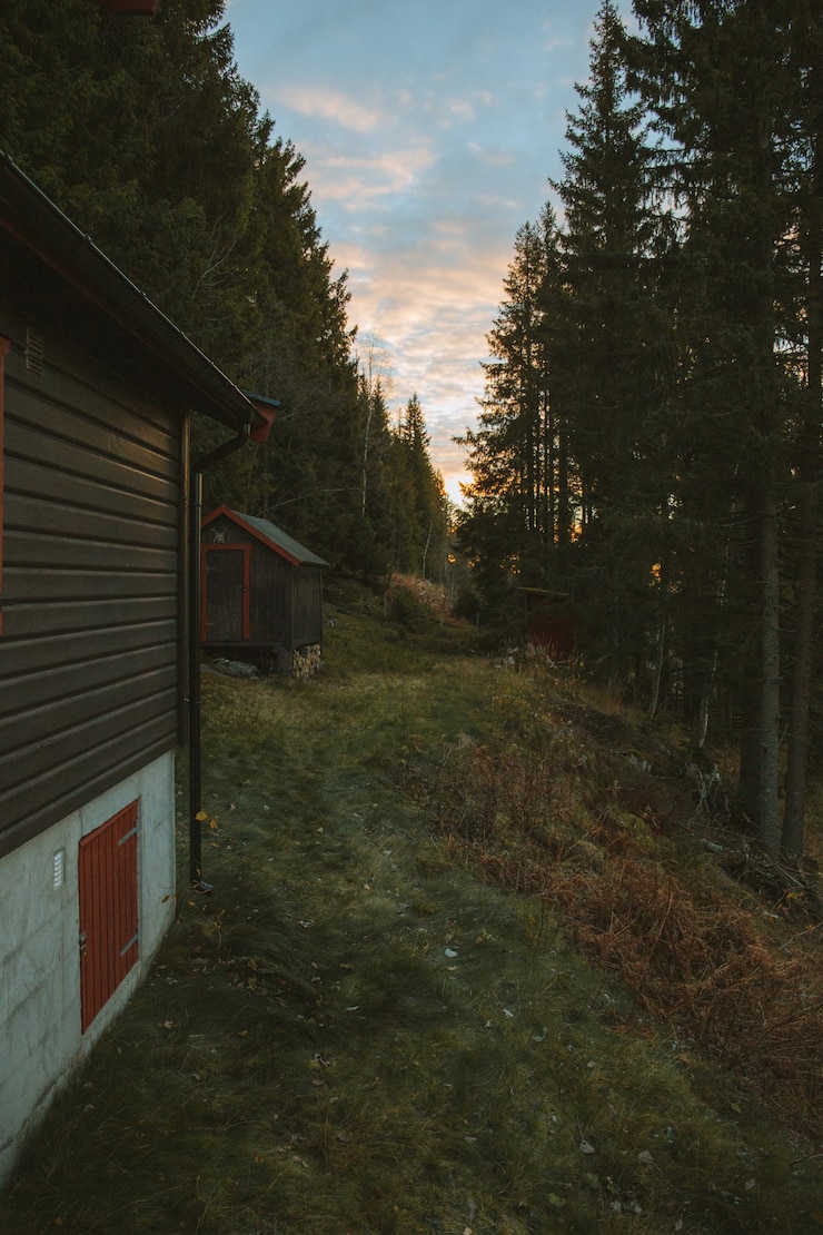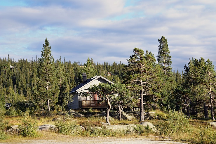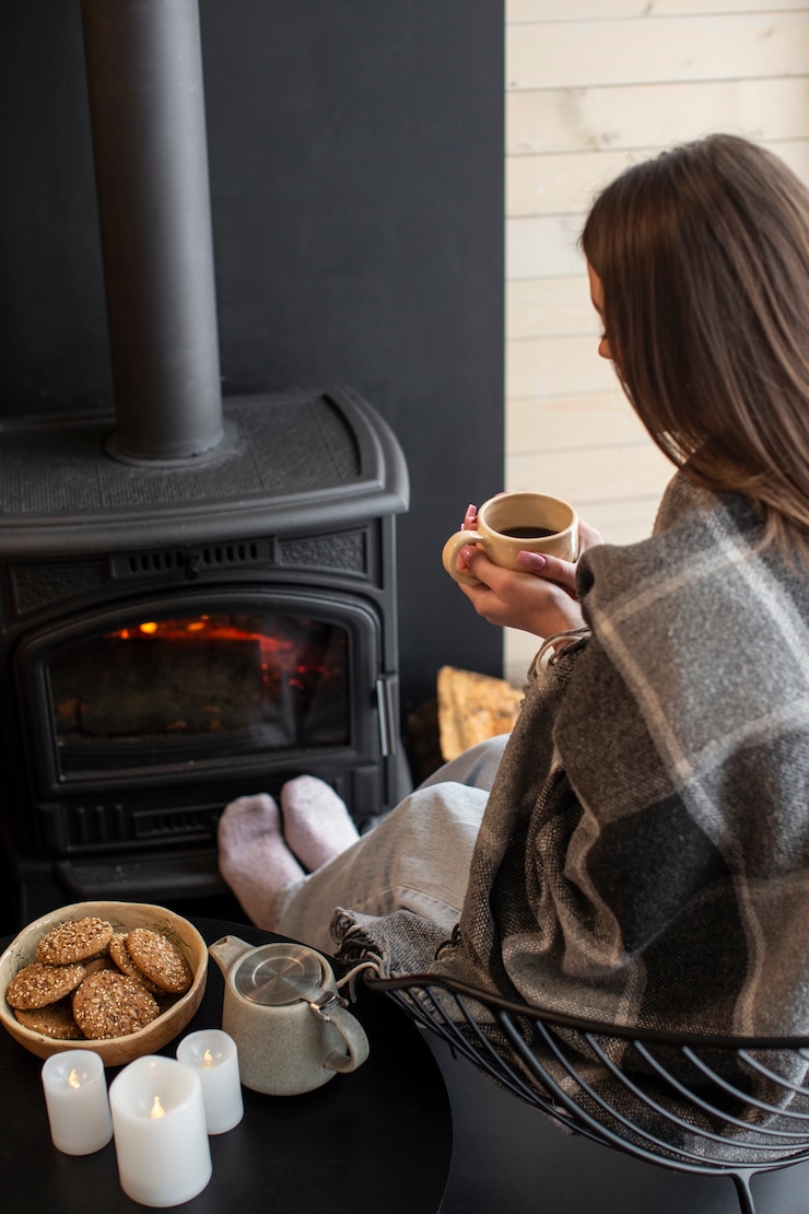 Для отделки стен выбрали имитацию бруса, покрытую краской. Стена за камином выполнена из стабилизированного мха. Дизайнер отмечает: «Важно помнить, что мох в отопительный период твердеет, сохнет и может рассыпаться при прикосновении, поэтому обязательно используйте увлажнитель воздуха». Камин сделан из архитектурного бетона, также использована изготовленная вручную керамическая плитка — листья на камине и полочка перед топкой.