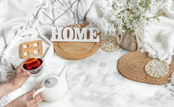 В интерьере присутствуют элементы, гармонирующие с ультрамодным стилем и классикой: плетеные корзины, простая деревянная мебель, ткани из натуральных материалов пастельных оттенков.