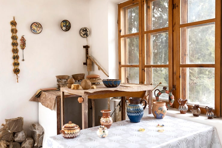 При оформлении интерьера необходимо избегать современных тенденций, которые не соответствуют принципам натуральности и экологичности. Не рекомендуется применять линолеум, ламинат, пластик, натяжные потолки или плитку с актуальными рисунками. Также стоит отказаться от хромированных ручек, смесителей и других декоративных элементов. Вместо этого целесообразно использовать медь, бронзу и кованые детали, даже выполненные из состаренного железа.