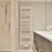 В проекте санузла застройщик предусмотрел комфортную и вместительную душевую кабину, поэтому ее расположение осталось прежним, а в нише дополнительно установили функциональные полки. Кроме того, здесь удалось разместить стиральную машину под столешницей, для чего пришлось тщательно подбирать размеры между машиной и дверью санузла, используя нестандартные двери. Рядом с раковиной установлено большое зеркало и тумба для хранения с открытой полкой для полотенец.