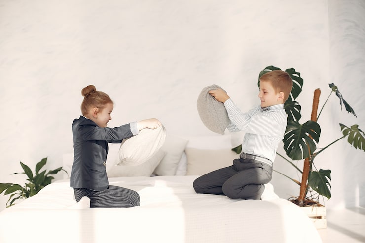 Использование более спокойной цветовой гаммы в комнате для двух школьников позволяет создать благоприятное пространство для проявления индивидуальности. Выразительным акцентом стало оформление стен с обоями, украшенными узором под названием «Happy».