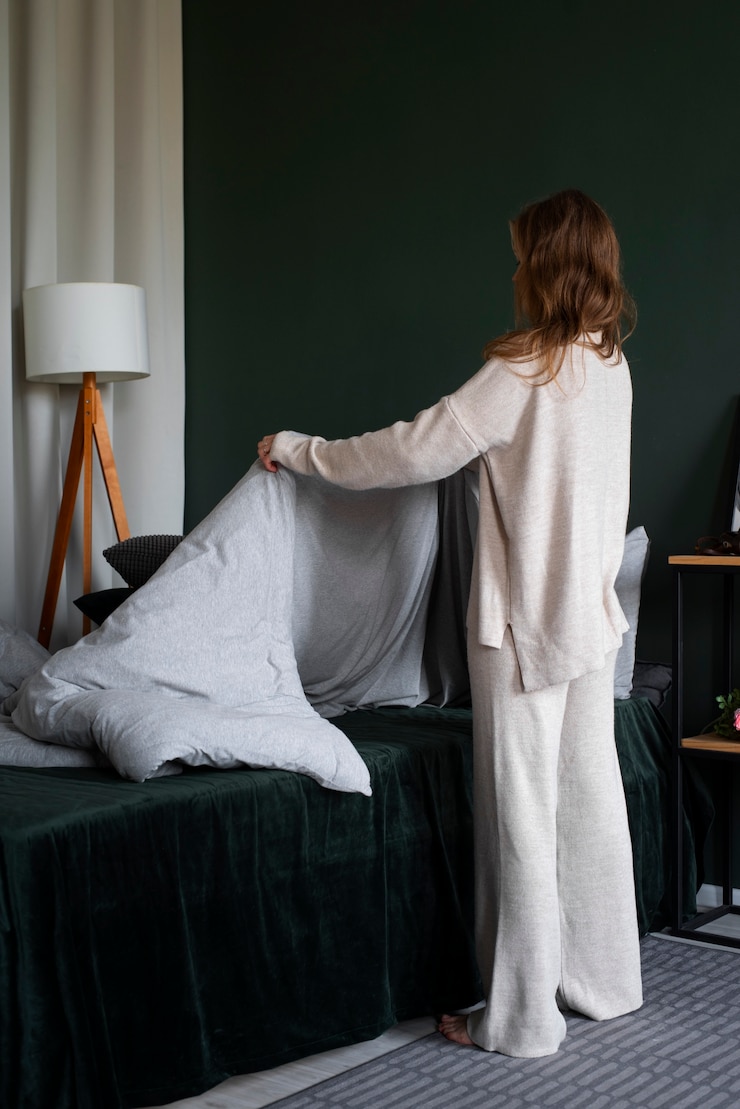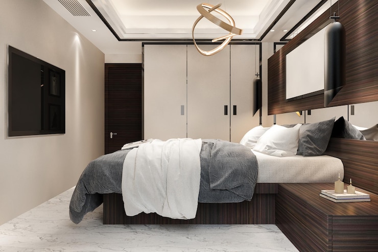 Кровать-бокс стала любимым предметом. Это каркас, обтянутый тканью с ящиками снизу, на который хорошо ложится матрас, для которого шьют чехол в цвет каркаса. Настенные мягкие модули дополняют эту зону, делая ее комфортной и как диван, и как полноценную кровать.