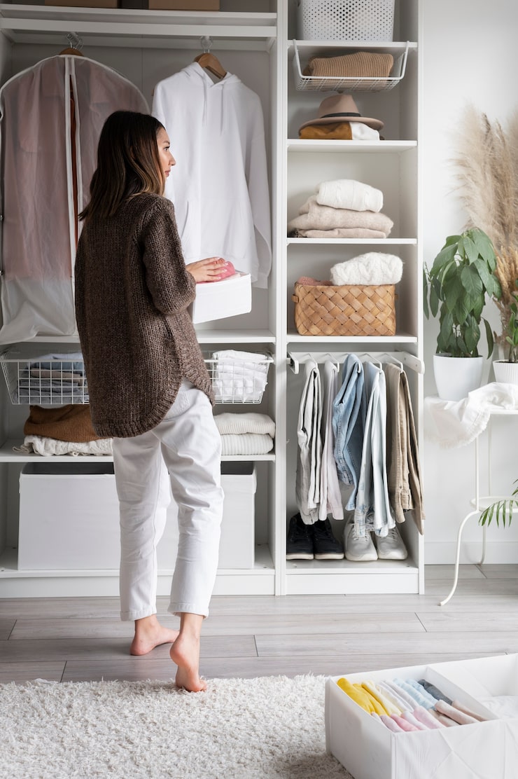 Чтобы избежать излишней застройки комнаты перегородками, организуйте гардеробную зону. При выборе систем хранения рекомендуется отдавать приоритет компактным решениям. Для этого можно использовать вешалку на колесиках, стеллаж с корзинами вместо традиционного шкафа, а также органайзер для нижнего белья и небольших аксессуаров.