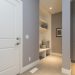 В интерьере всей квартиры используются элементы, выполненные в золотом цвете, что акцентирует стиль современной классики. На кухне такими деталями являются смеситель, фурнитура на окнах и шкафчиках, а также розетки и выключатели.