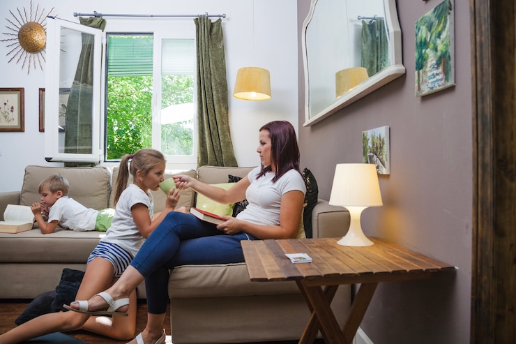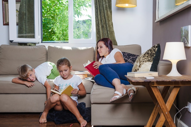 В гостиной установили кровать-трансформер, сконструированную по индивидуальному заказу. Деньем она выполняет функцию комфортного дивана для семейных сборищ и релаксации, а ночью превращается в полноценное спальное место для родителей.