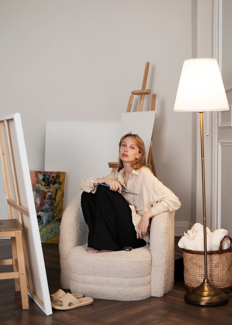 При оформлении интерьера были выбраны сдержанные, неяркие материалы, призванные не перетягивать на себя внимание от художественных элементов. Стены во всех помещениях окрашены, а в спальне их декорируют текстильными обоями. Полы в комнатах выложены паркетной доской, а на кухне и в ванной использован натуральный камень – кварцит Taj Mahal. Из него же создали столешницу и обрамление кухонной зоны, что обеспечило как эстетичный, так и функциональный результат.