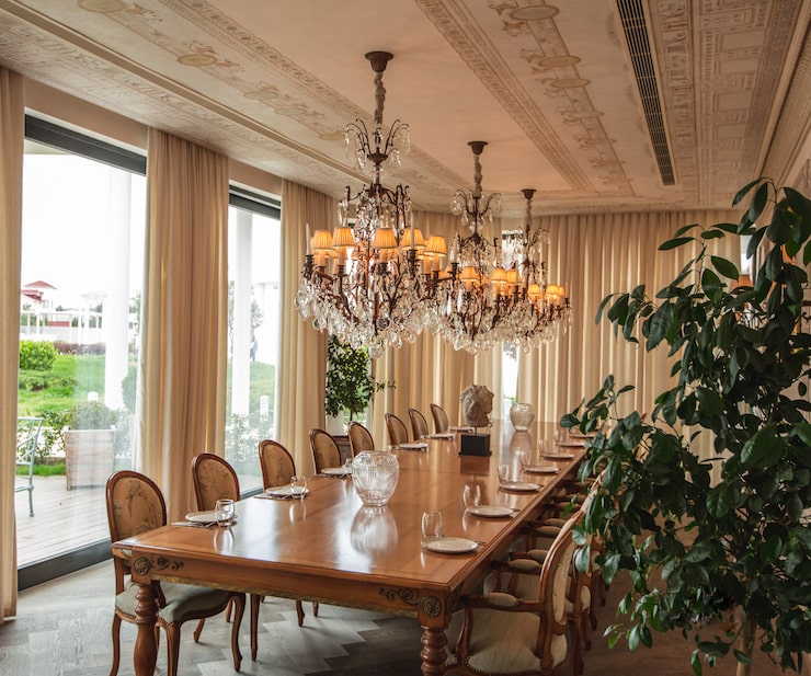 Заказчице импонировали старинные винтажные предметы, однако она не принимала решения о приобретении. В связи с этим дизайнер отобрала предметы, воссоздающие желаемую обстановку благодаря ретро-стилю, в частности, роскошные хрустальные светильники Eichholtz над обеденным столом.