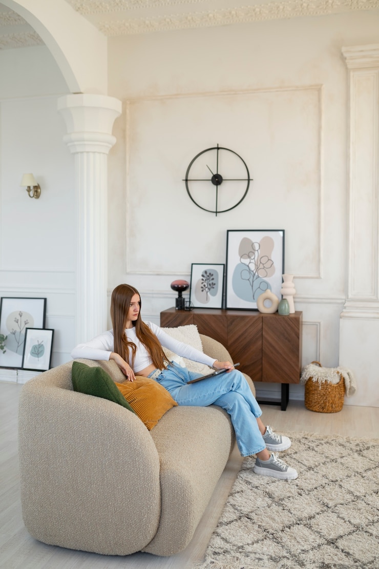 Для оформления интерьера были подобраны нейтральные оттенки и молдинги, дополненные акцентными элементами. Стены в общих помещениях и кабинете декорированы обоями бежевого цвета, имитирующими рогожку, и обрамлены молдингами, выкрашенными в цвет стен. В главной спальне над изголовьем кровати расположено панно в серых тонах с растительным орнаментом; подобное решение использовано и в гостевой комнате на стене за диваном. В кухне-гостиной и коридоре на полу проложено виниловое покрытие «елочкой», что добавляет изысканности и отлично вписывается в просторные комнаты. Чтобы сэкономить средства, в гостевых комнатах, кабинете и спальне на полу постелен ламинат.