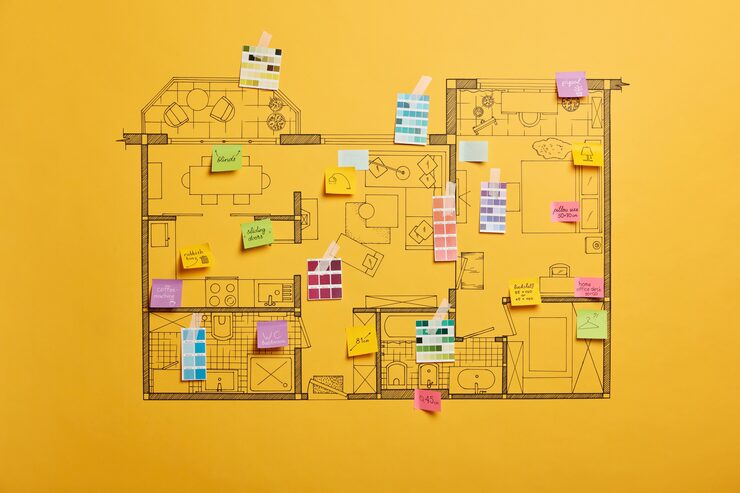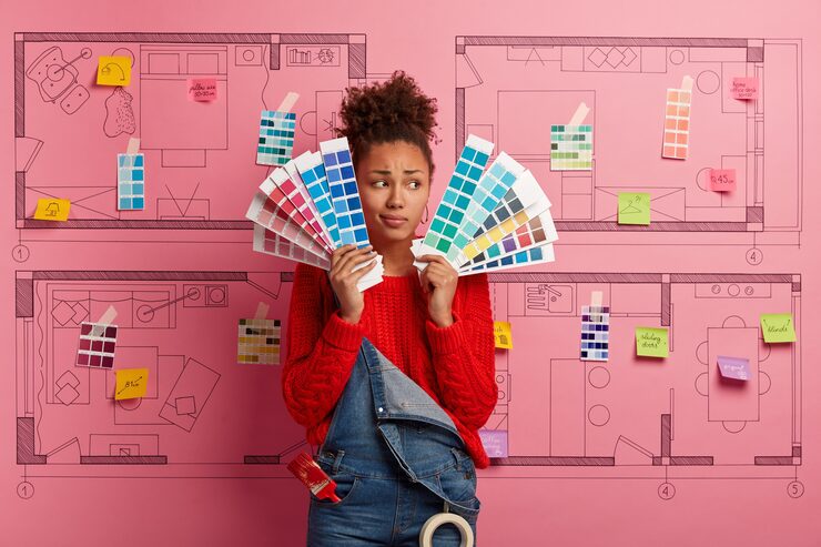 Для отделки гостиной применены шпон сланца и декоративная штукатурка, в то время как остальные стены покрашены водоэмульсионной краской. Цветовая гамма включает в себя насыщенные, но не кричащие тона, создающие ощущение спокойствия.