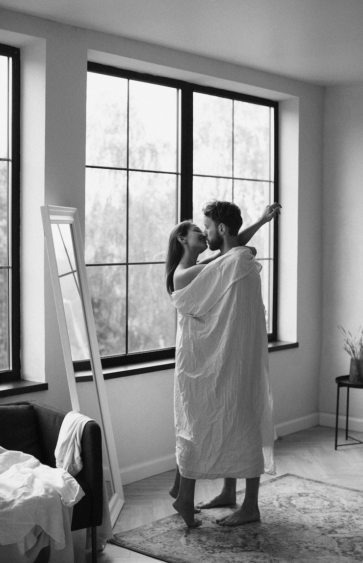 Рядом с окном расположена обеденная зона с круглым столом, мягкими стульями и подвесным светильником в стиле лофт. Радиаторы сохранили свою форму, но перекрасили их в черный цвет для соответствия стилю лофт. Функциональность и стиль сочетает деревянные откосы и подоконники.