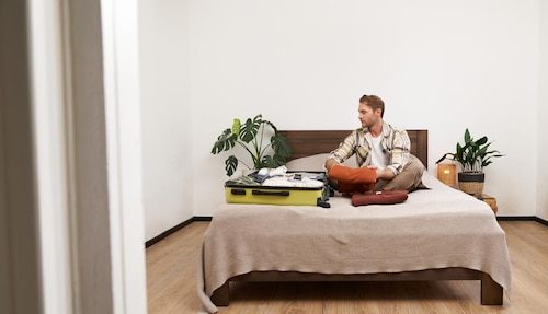 В другой части комнаты прячется секрет: просторная гардеробная, спрятанная в углублении за кроватью. Благодаря такому расположению мебели здесь не занимают много места, все нужное хранится за перегородкой.