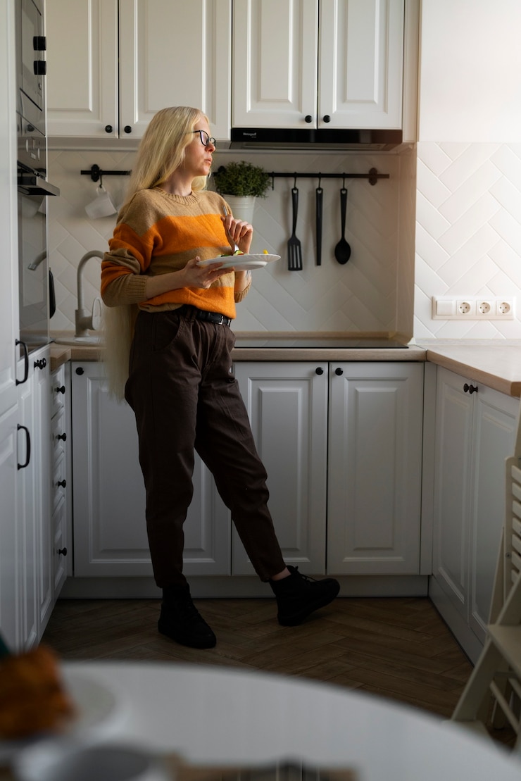 На полу лежит кварц-винил. Материал не боится влаги, устойчив к износу и легко моется. Хорошо подходит для кухни, где часто происходят разливы и падения предметов.