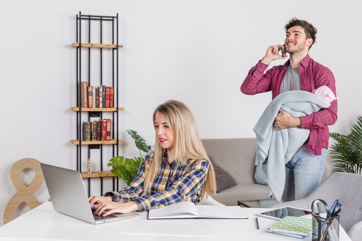 Для организации комфортного рабочего пространства потребовался лишь небольшой стол, стул и полка для размещения декоративных элементов и необходимых мелочей. Семейная пара, арендующая эту квартиру, выразила признательность за предоставленную возможность удаленной работы.