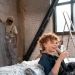 Потолок и стены оформлены в одном цвете, что создает ощущение целостности. Панели большой площади на стене мягко перетекают на потолок, формируя рельеф, добавляющий текстуру и визуально разделяя помещение, отделяя зону отдыха от кухни. Стол для обедов круглой формы, изготовленный из светлого дерева, отличается лаконичным дизайном и имеет возможность раскладывания, что обеспечивает комфортное размещение гостей. Компактный диван также трансформируется в полноценное спальное место.