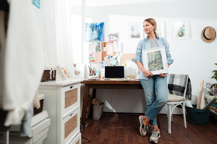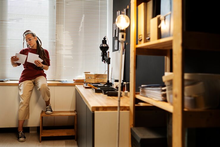 Рабочее пространство отличается достаточной вместительностью, что создает удобные условия для выполнения задач. Из окна открывается красивый вид, благодаря чему зона у окна была обустроена для отдыха, а на подоконнике размещен стеллаж, который позволяет удобно хранить учебные материалы и необходимые вещи. Стеллаж закрыт шторной занавесью и оснащен подсветкой.