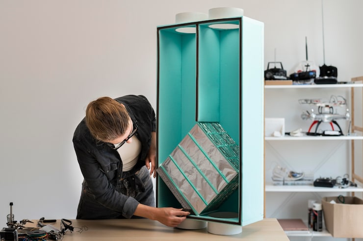 Узкая обувница с наклонными полками, способная вместить обувь всех членов семьи, расположена в прихожей справа от входа. Слева от нее находится шкаф для верхней одежды, нижняя секция которого предназначена для размещения базы робота-пылесоса. Также здесь предусмотрен скрытый шкаф для стиральной машины и хранения хозяйственных средств.