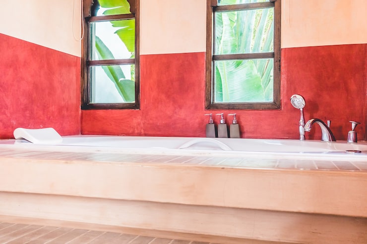 Ванная комната способна задать тон всему дому: сочетание насыщенного кораллового и глубокого синего цветов выглядит необычно, но создает впечатляющий эффект. Стены, потолок и ниши в душевой зоне облицованы мелкой мозаикой, что придает помещению графический вид. Подсветка, расположенная в каждой нише, создает мягкое красное свечение, добавляющее интерьеру ощущение театральности.