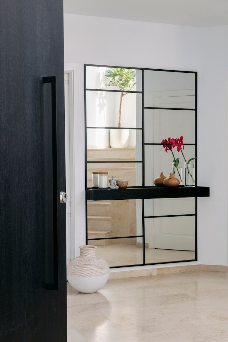 Встроенный шкаф и зеркало органично вписываются в интерьер, обеспечивая удобство и функциональность прихожей. Подобно другим помещениям квартиры, зеркала визуально увеличивают пространство и способствуют лучшему освещению.