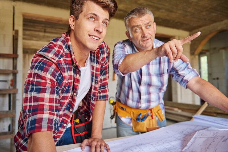 Для организации всех необходимых помещений в ограниченном объеме дизайнеры построили в центре дома надежную деревянную конструкцию. На «втором этаже», расположенном под крышей, разместили ванную комнату, спальню и кабинет с оригинальной планировкой: санузел отделен от спальни лишь перегородкой, не достигающей потолка. Лестница была скрыта внутри этой конструкции, а вдоль одной из стен расположили кухонный гарнитур.