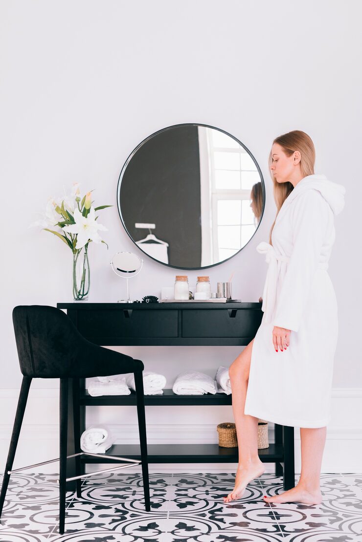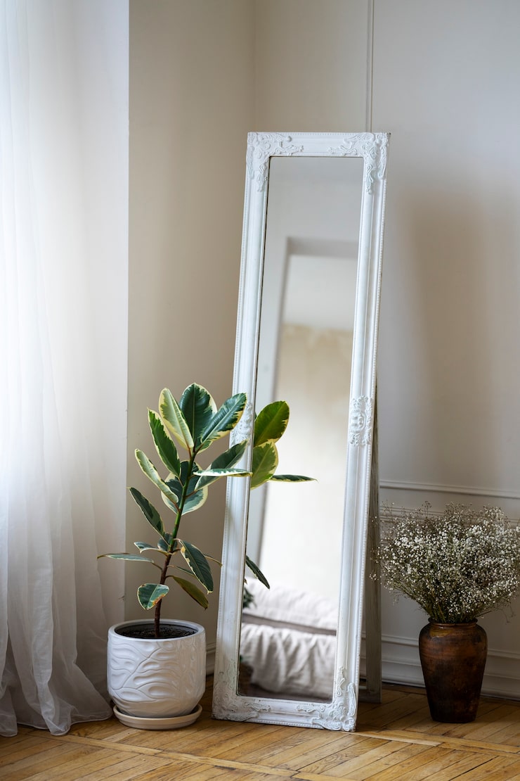 - Зеркала визуально удваивают пространство. Большое зеркало на торцевой стене создает иллюзию длинного помещения. Зеркальные элементы в декоре добавляют света и воздуха.