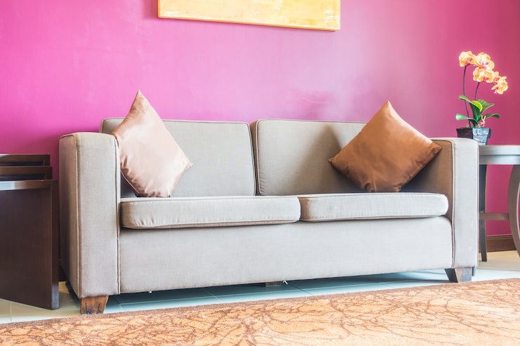 Elegantпрямой диван на четыре посадочных места, оснащенный подлокотниками, обивка из рогожки, цвет — розовый, размеры: 242x70x105 см