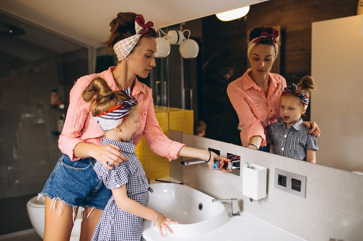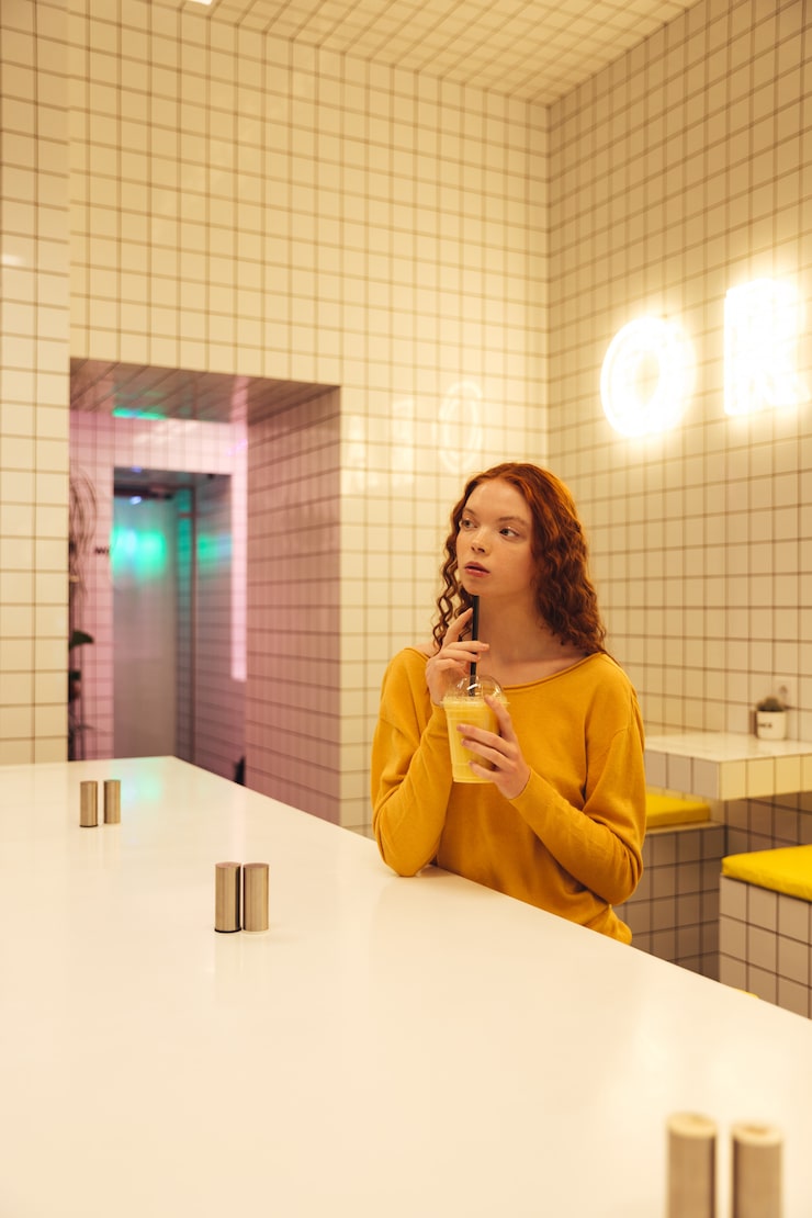 Яркая мебель желтого цвета стала заметным акцентом. Для хранения предусмотрена подвесная тумба, расположенная под раковиной. Чтобы унитаз не мешал открыванию дверцы, в одной секции полки сделали открытыми. Также имеется шкафчик для хранения ванных принадлежностей. Завершающим штрихом стала яркая картина, которая объединяет все оттенки интерьера и придает ему индивидуальности.