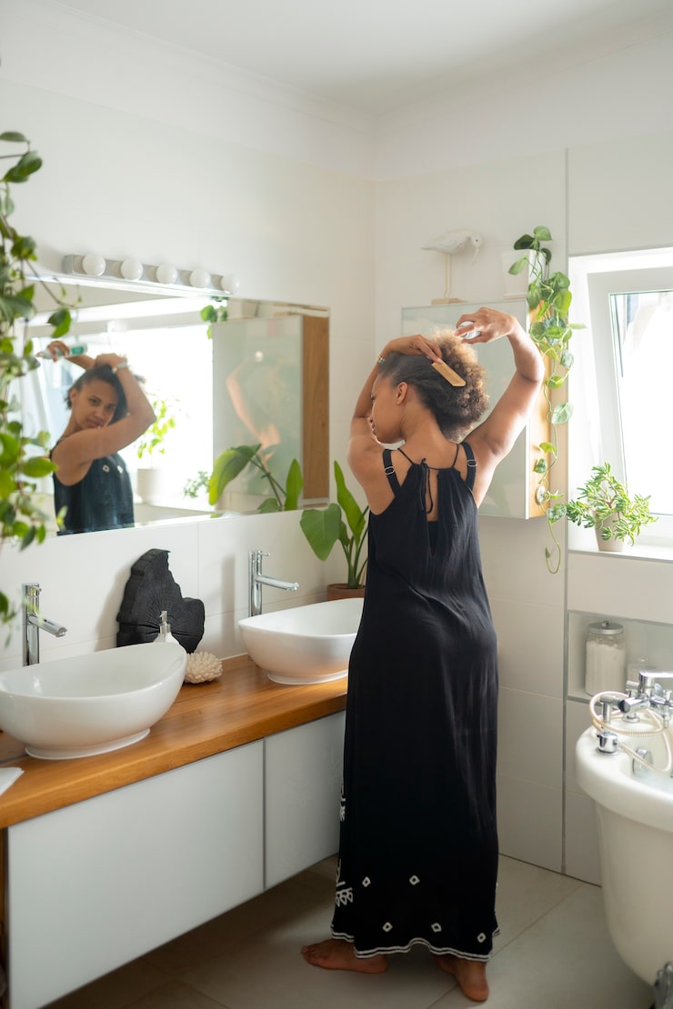 Белые стены и потолок создают интересный контраст, символизирующий чистоту и свежесть. Стеклянная перегородка в душевой зоне придает помещению легкости и современный вид.