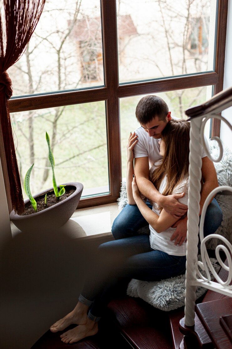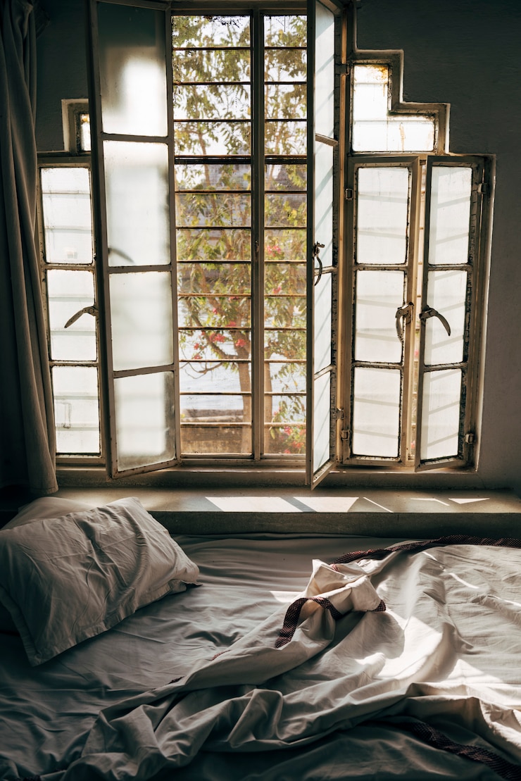 В спальной зоне изголовье кровати оформили рисунком, состоящим из арок и кругов. Этот декор перекликается с арочным проходом, ведущим в гардеробную. В гостиной на окнах можно использовать льняные шторы, которые создадут ощущение уюта и обеспечат приватность помещению.