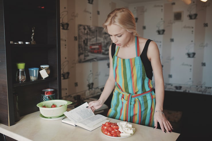 Кухню оформили в небесно-голубых тонах, покрасив стены и потолок. Для облицовки фартука использовали недорогую белую плитку квадратной формы. Кухонный гарнитур был собран из готовых модулей, что позволило уложиться в бюджет 30 тысяч рублей. Вместо верхних шкафов была установлена полка, выкрашенная в контрастный красный цвет. Дверь в кухню также выполнили в этом же оттенке. Холодильник, не требующий встраивания, расположили в нише.
