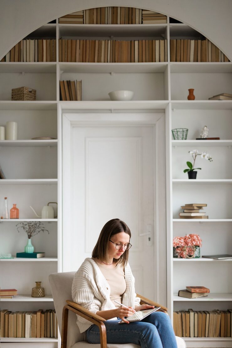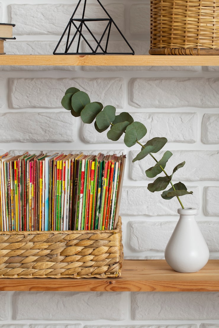 Если нет возможности выделить отдельную стену под библиотеку, рассмотрите напольные стеллажи. Они занимают меньше пространства, их можно установить вдоль стен, а на верхние полки поместить картины, цветочные горшки или рамки с фотографиями. Как и в предыдущих случаях, в этих стеллажах достаточно ячеек для размещения книг по темам, авторам или по цвету обложки. Это позволит оперативно находить нужную книгу в любой момент.