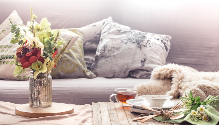 Дизайнеры проекта использовали яркие, сложные цвета: зелено-синяя прихожая, терракотовая кухня, синий диван виден из прихожей. Спальня выполнена в благородном серо-зелёном цвете со светло-розовой кроватью — смелый и свежий интерьер.
