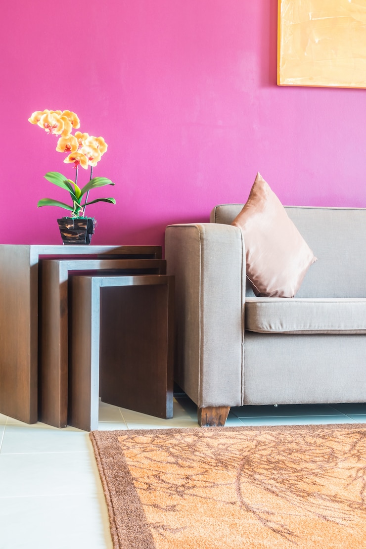 Холл получился эффектным — стены и потолок покрасили в ярко-малиновый цвет, а пол уложили из черной мозаики. Сразу видно, что здесь живёт творческая личность.