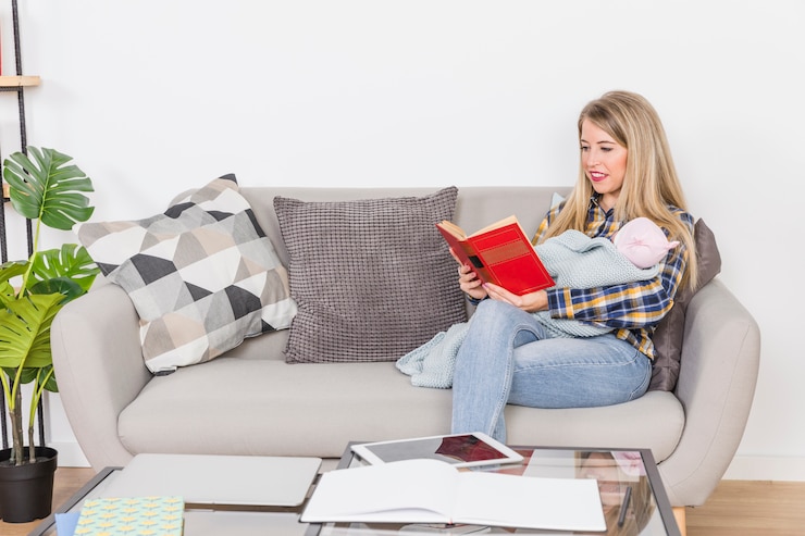 С спальни есть выход на лоджию с зоной отдыха и домашней библиотекой. Для более уюта потолок покрасили в тот же цвет, что и стены.