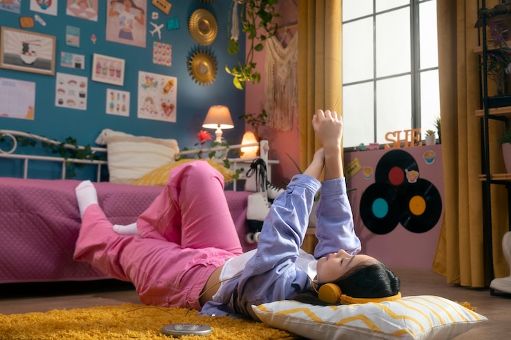 В спальне использовали глубокие тона: 3D-панели у изголовья кровати покрасили розовым, а остальной стены — синим. Встроенные системы хранения из дерева теплого оттенка добавили комнате глубины.